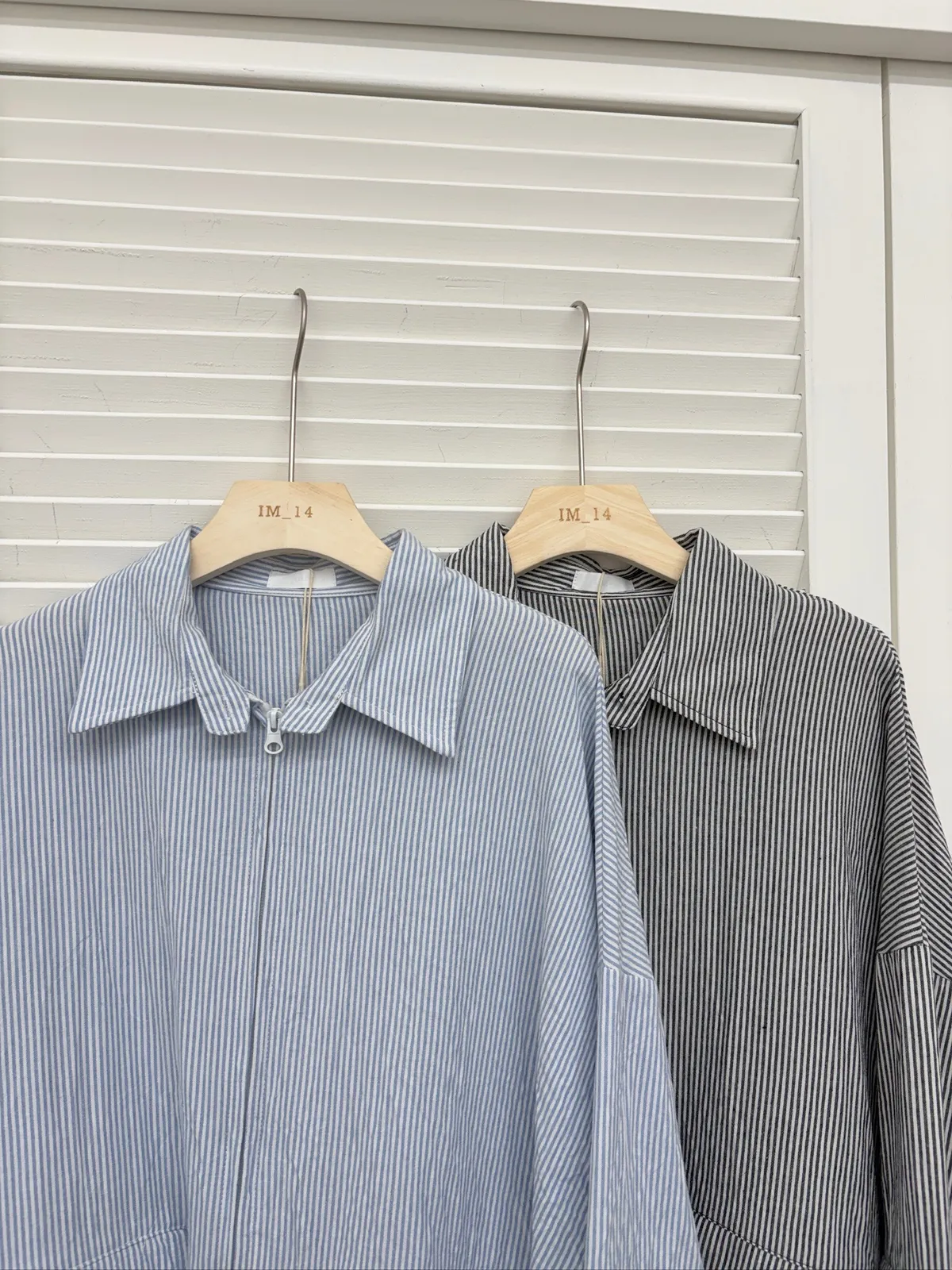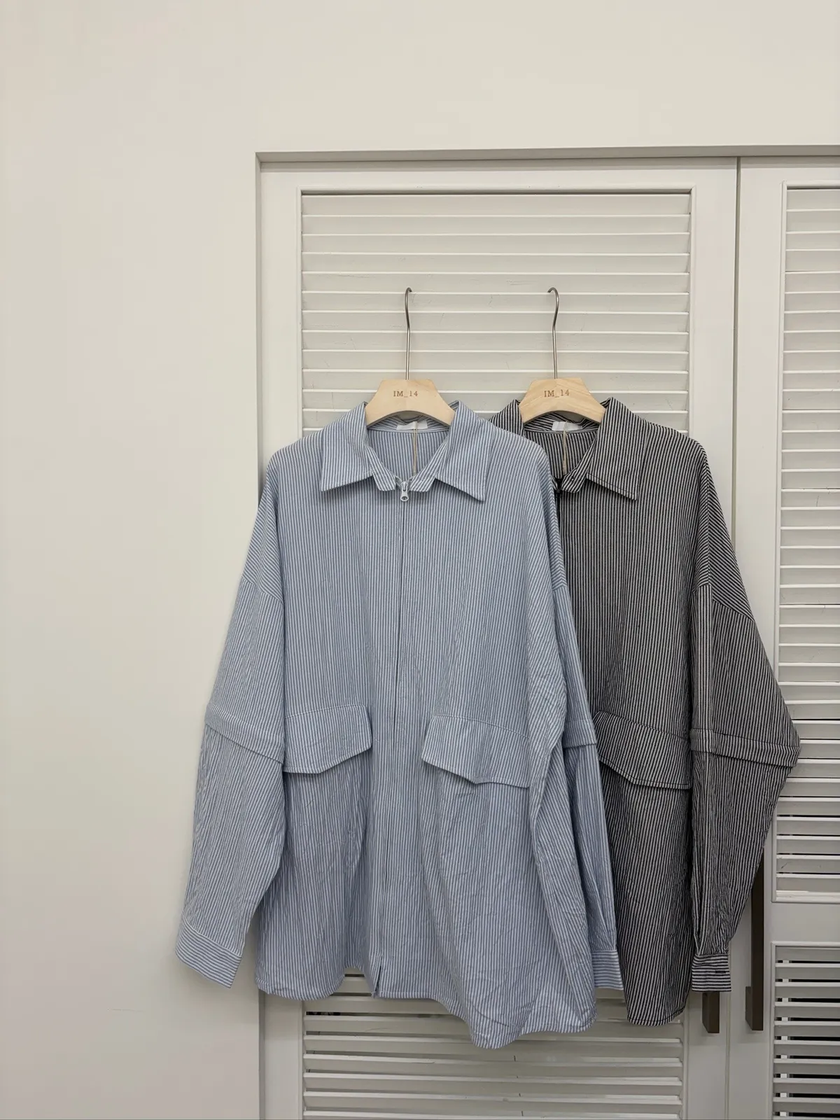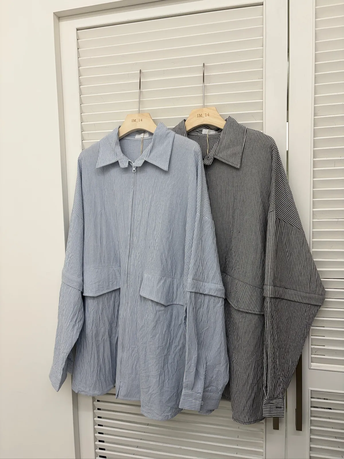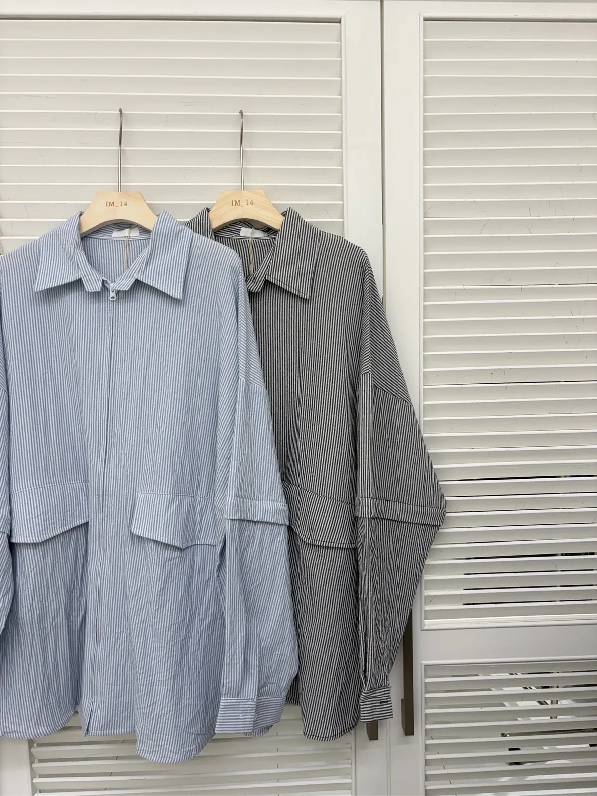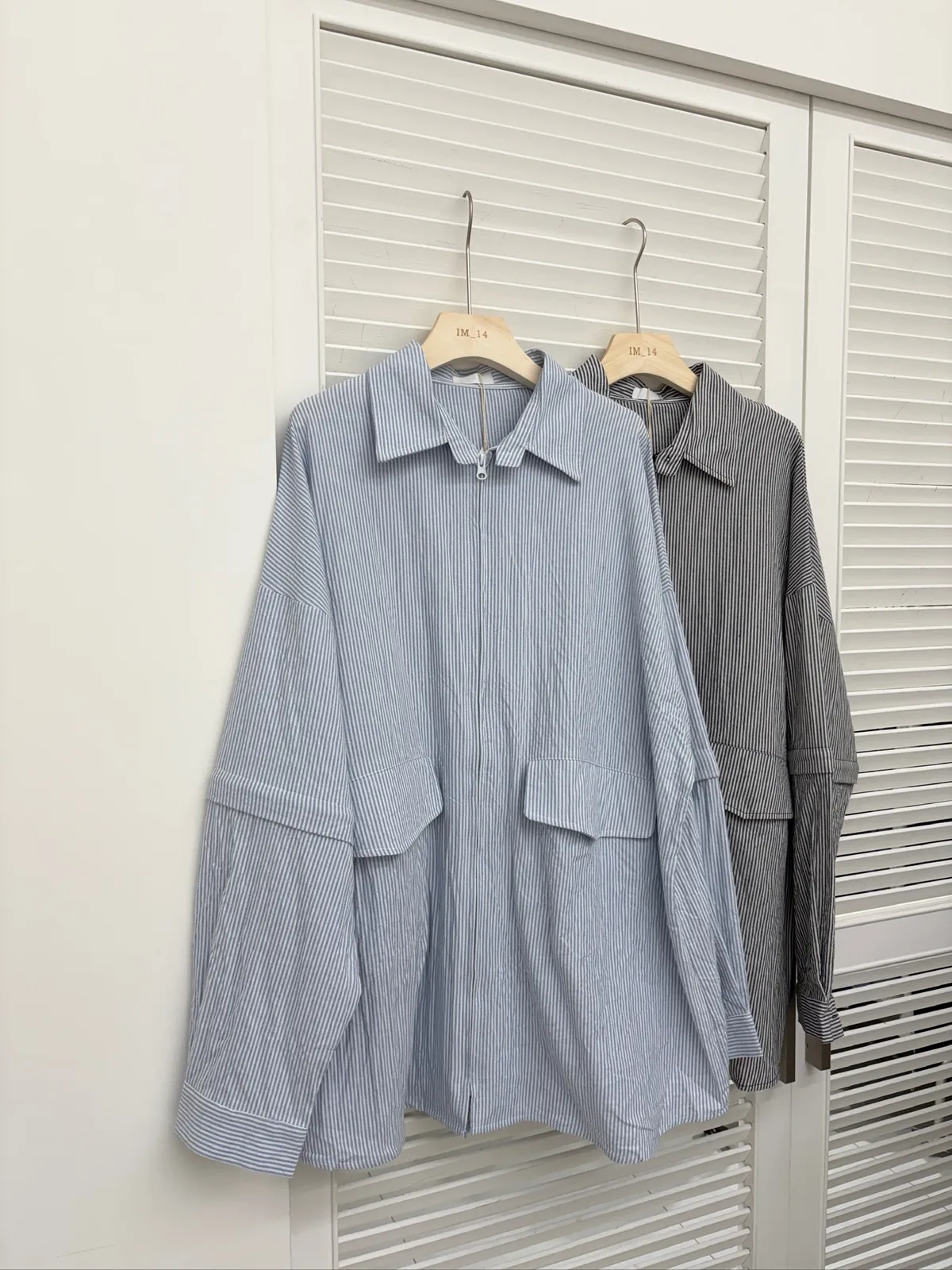 大版~ 袖可拆挺版皺皺直條拉鍊襯衫